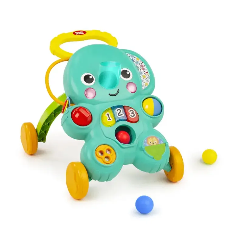 Sid-og-leg eller skub-og-gå med Stroll ‘n Roll-boldspilleren fra Bright Starts! Dette 2-i-1 gålegetøj vokser med dit barns udvikling og vil give din familie mange års glæde. Når den bruges som gulvlegetøj, er der så mange aktiviteter, der kan fange dit barns opmærksomhed. Gør dig klar til at have det sjovt med den interaktive elefantsnabel! Baby vil træne finmotorikken ved at lægge bolde i elefantens snabel, hvilket aktiverer lys og lyde. De store klavertangenter, der er nemme at trykke på, tæller til 1, 2, 3 med push & play fjollede lyde og farveintroduktion. Drej den flerfarvede bold for at få en sjov overraskelse. Eller vend den og se skjulte safarivenner. Den bevægelige stige, drejehjulet og det snurrende ratlegetøj fremmer finmotorikken. Dans med til de over 70 sange samt lyde og ordsprog på tre sprog. Når barnet vokser, kan dette sidde- og lege-legetøj også bruges som skubbevogn! Øv dig i at gå tidligt med mere pep i hvert skridt. Dette glade produkt bruger tre AA-batterier (ikke inkluderet).
