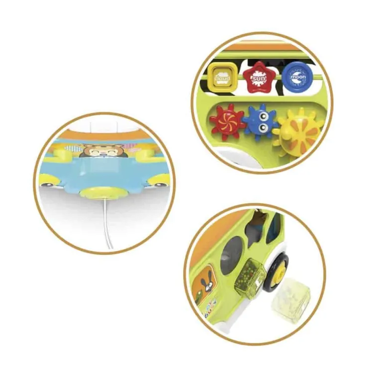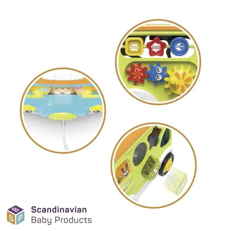 Sjov og lærerig aktivitets-bus fra Scandinavian Baby Products. Bussen har mange funktioner: put-i-hul kasse, spil sjove melodier, spil klaver, skru hjulene af med den tilhørende skruetrækker eller træk bussen efter dig. Batterier isættes øverst på bussens tag ved at fjerne lågen med en rigtig skruetrækker. Dette skal håndteres af en voksen, og lågen skal lukkes korrekt efter batteriskift.