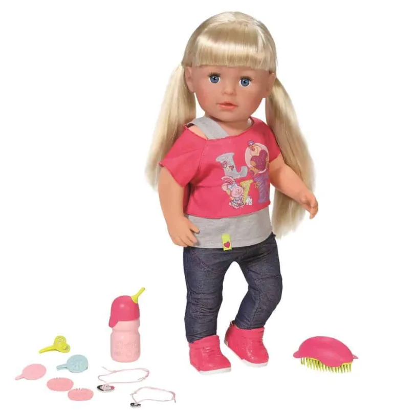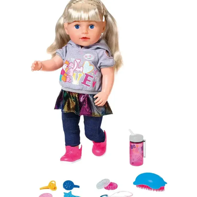 Baby Born baby har fået en søster. Baby Born Sister har samme kropsstørrelse som den klassiske dukke, så de passer samme tøj. Baby Born Sister har fleksible led, så hun bedre kan bevæge sig. Hun kan græde rigtige tårer, stå selv, har langt fint hår, og kommer med en masse fint tilbehør. Inkluderer: 1 trøje, 1 par leggins, 1 par sko, 1 flaske, 1 hårbørste, 3 hårklemmer, 2 hårelastikker og 1 venskabsarmbånd. Fra 3 år.