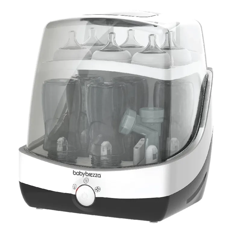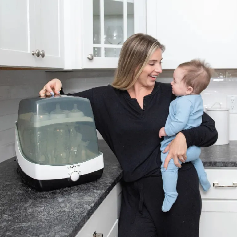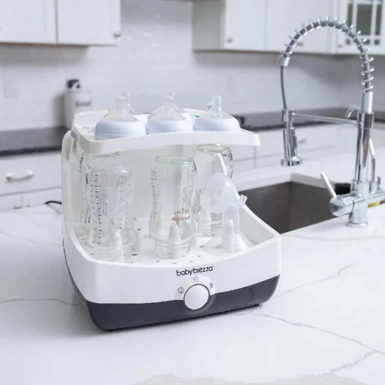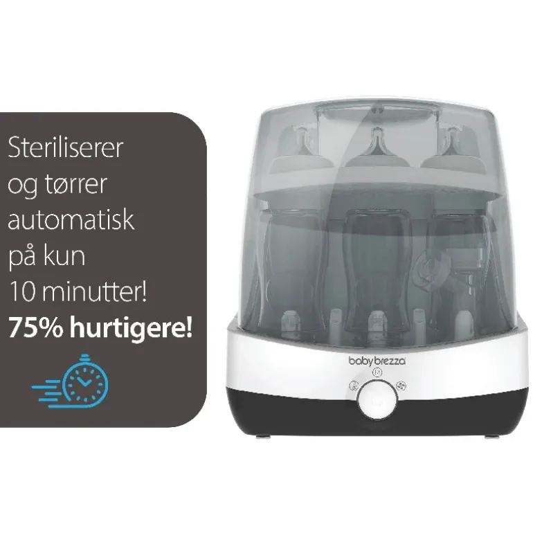 Baby Brezza SuperFast Sterilizer Dryer er den hurtigste sterilisator og tørremaskine. På bare 10 minutter steriliserer og tørrer den flasker, brystpumpedele og tilbehør helt automatisk. Den er 75 % hurtigere end andre sterilisatorer, så du kan tage flasker med på farten uden at behøve at planlægge brugen af flasker på forhånd. Ved hjælp af naturlig varm damp dræber den 99,9 % af alle bakterier og tørrer derefter automatisk alt med varm luft. Produkterne forbliver steriliserede indeni i op til 24 timer. Den har plads til 6 flasker, brystpumpedele og tilbehør fra alle mærker. Med et enkelt tryk på en knap kan du vælge mellem 4 forskellige programmer (Sterilisering og Tørring; Kun Dterilisering; Kun Tørring; Opbevaring). Sig farvel til en gammeldags måde at sterilisere på, og sig goddag til SUPERSNABB-sterilisering og -tørring! BPA-fri. 2 års begrænset garanti.