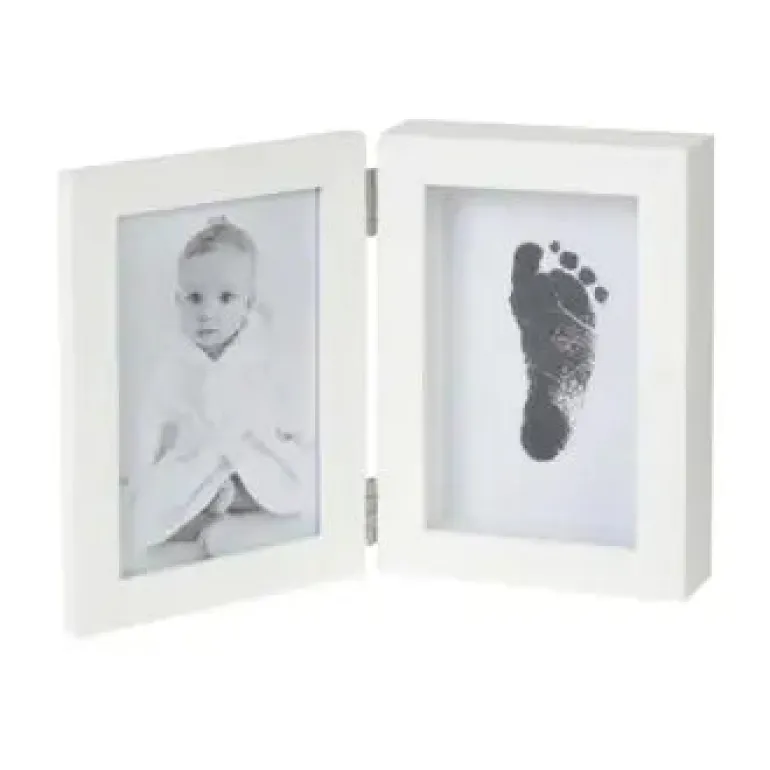 En charmerende træbilledramme til at vise babys hånd eller fodaftryk. Sættet indeholder en hvid hængslet billedramme til montering af et fotografi og en blækpude til at fange trykket. Malet træ og glas Rammestørrelse: 12×17 cm Holder fotografier 9,5×14,5 cm. Leveres med sort blækpude Velegnet til drenge og piger