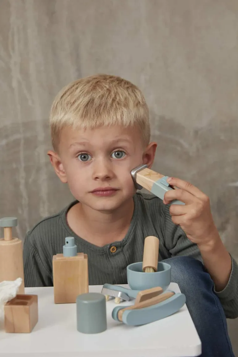 Indeholder 8 dele. Trimmer med ekstra hoved, barberblad, barberskum, skål, barberbørste, barberskraber og aftershave.