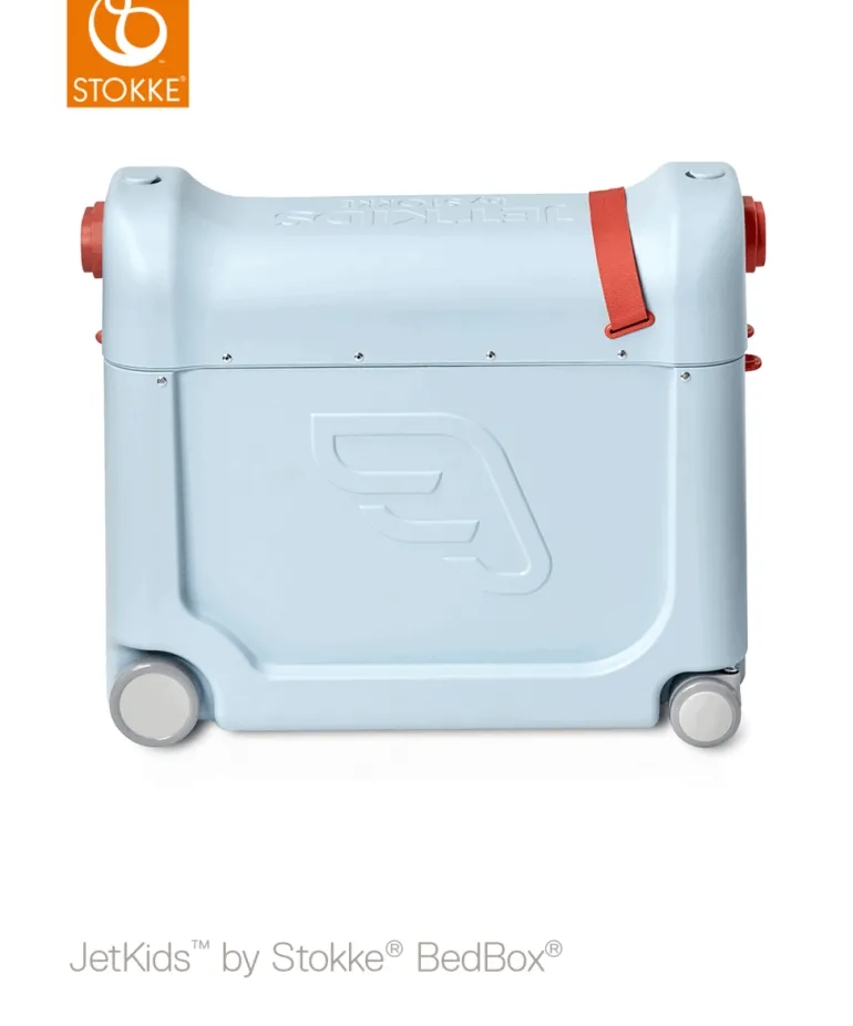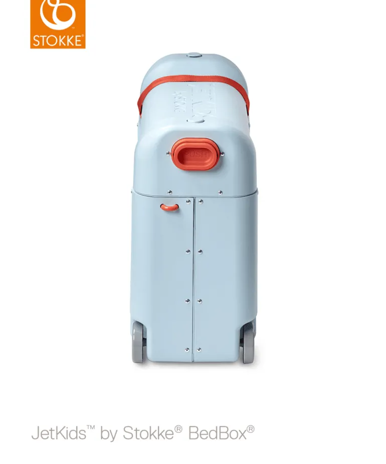 JetKids™ by Stokke® BedBox™ – Blue Sky, er verdens eneste ride-on kuffert til børn, som kan bruges som en flyseng eller benstøtte.