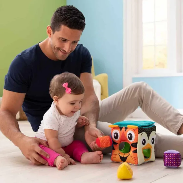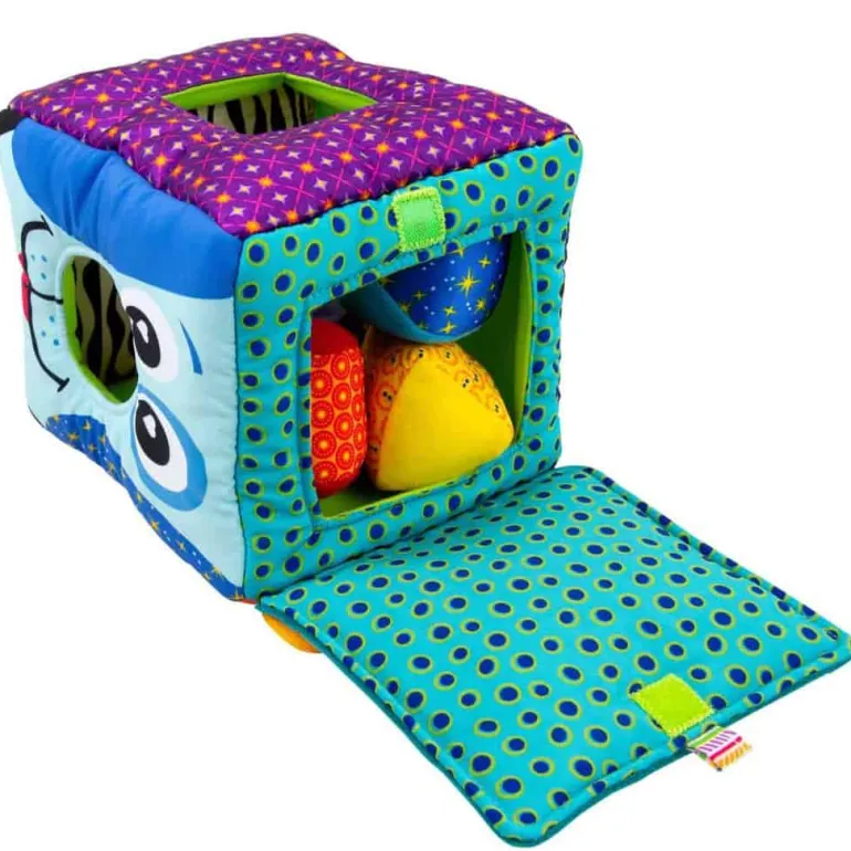 En blød kasse fyldt med indlæring. Find den rigtige form og det rigtige mønster til den rigtige åbning. Hver form har sin egen overraskende lyd-og sanseoplevelse.
