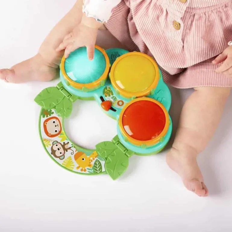 Hvad er musik for mor og fars ører? Babys søde små grin, selvfølgelig. Med Safari Beats™ musiklegetøj fra Bright Starts vil der være masser af grin og fnis. Hvert tryk på en farvestrålende knap vil få din lille til at hoppe i takt. Skift fra trommetilstand til meloditilstand og opdag en helt ny safari-verden af lyde. Håndtaget er let at gribe om, så din lille party-abe kan hoppe rundt og dele de sjove melodier overalt, hvor han eller hun bevæger sig. Men uanset om der bliver lavet trommelyde på trommen eller sunget søde sange, så bliver det helt sikkert en vild koncert, som du ikke vil gå glip af.
