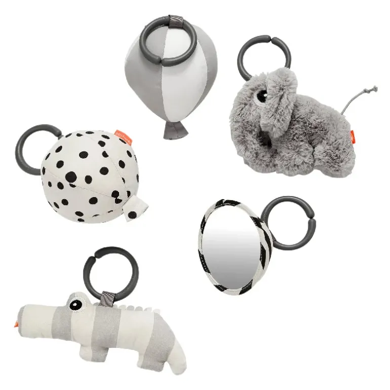 Hæng legetøjet op i 13 forskellige positioner på buerne. Croco knitrer, når den røres, Elphee rasler, det lille spejl smiler tilbage, og ballonerne indeholder både en klokke og en bjælde alt sammen for at stimulere din baby.