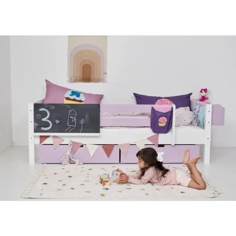Denne seng er en god begynderseng, og en sikker overgang fra babysengen eller måske fra den lille juniorseng. Her kan barnet sove trygt og godt – “indrammet”, så det ikke falder ud, men samtidig med nem adgang til sengen uden at skulle kravle over sengehesten.