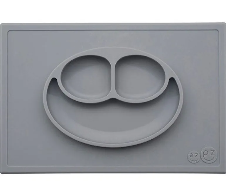 Ezpz Happy Mat er en – alt i én – tallerken og dækkeserviet i et. Produceret af højeste EU standard silikone (100%) som er helt fri for BPA, Phthalater, eller PVC. Happy Mat suger sig helt fast til bordet således at barnet ikke kan tippe eller løfte selve tallerknen. Fantastisk at skabe sjove, spændende og dekorative måltider til barnet.