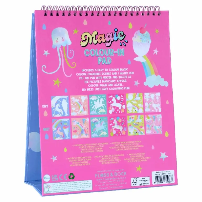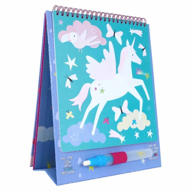 Vores Magiske vandtusser er så sjove! Ligesom vores populære vandkort skal du fylde pennen med vand og farve siderne for at se dem på magisk vis dukke op, og derefter forsvinde, når de er tørre. De 6 farvestrålende sjove ark holdes sammen med en spiralryg, så du kan vende dem om, når de er færdige. Det indbyggede staffeli holder siderne op, så du kan bruge den som en ‘rigtig’ kunstner! Siderne kan genbruges igen og igen, og du vil have meget sjov med at fremtrylle disse fantasifulde væsener! Perfekt til rejsebrug.