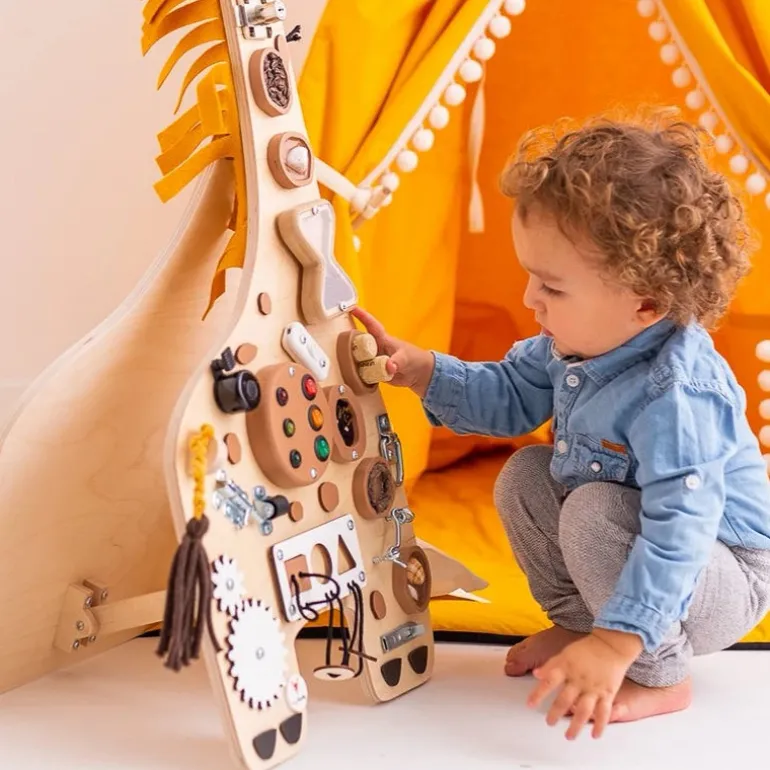 Giraffen Frank er fra Afrika, og den mest udnikke i Foxy-familien. Flink og stærk men også følsom. Sansepuderne adskiller hende fra de andre aktivitetstavler. Denne model kan både stå frit på gulvet og monteres på væggen.