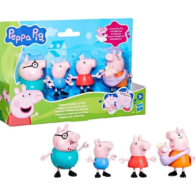 Gris-familien tæller nu fem medlemmer! Dette Gurli Gris-legetøjssæt omfatter Far Gris, Mor Gris, Gustav, Gurli og baby Evie i sin babystol.