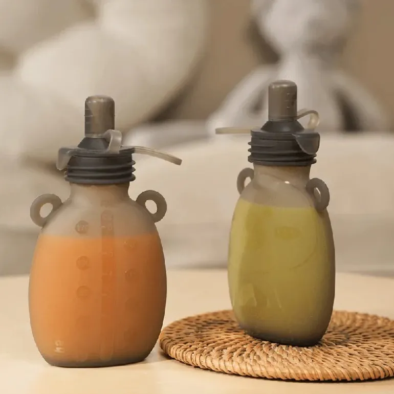 Brug den til hjemmelavede eller større portioner smoothies og giv dig selv bekvemmeligheden ved købte poser uden plastikubehageligheder eller miljøpåvirkning. Kapaciteten på 170 ml er perfekt til små hænder og maver. Den kryds-skårne variable flow Silikone Tud giver børn mulighed for at spise i deres eget tempo. Det medfølgende silikone sugerør kan bruges til væsker og tynde smoothies for at sikre, at hver eneste dråbe nydes, eller for hænder, der er lidt stærkere, kan du fjerne stroppen og klemme posen eller rulle den op nedefra.