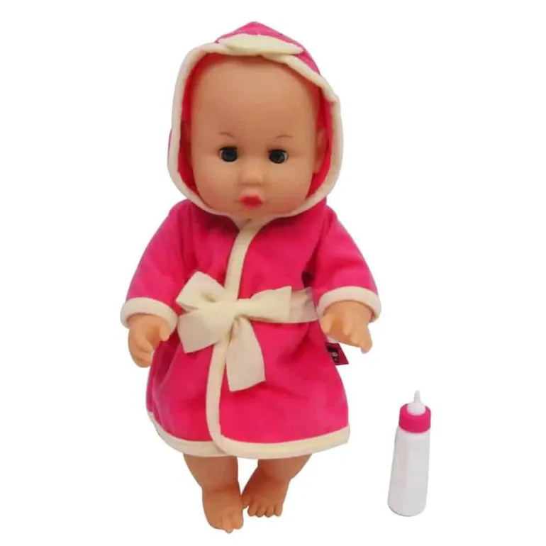Den søde dukke, Emma, er klar til sit bad! Hun har sin fine badekåbe på, og sutteflaske til når hun bliver sulten. Længde 30cm. Fra 3 år.