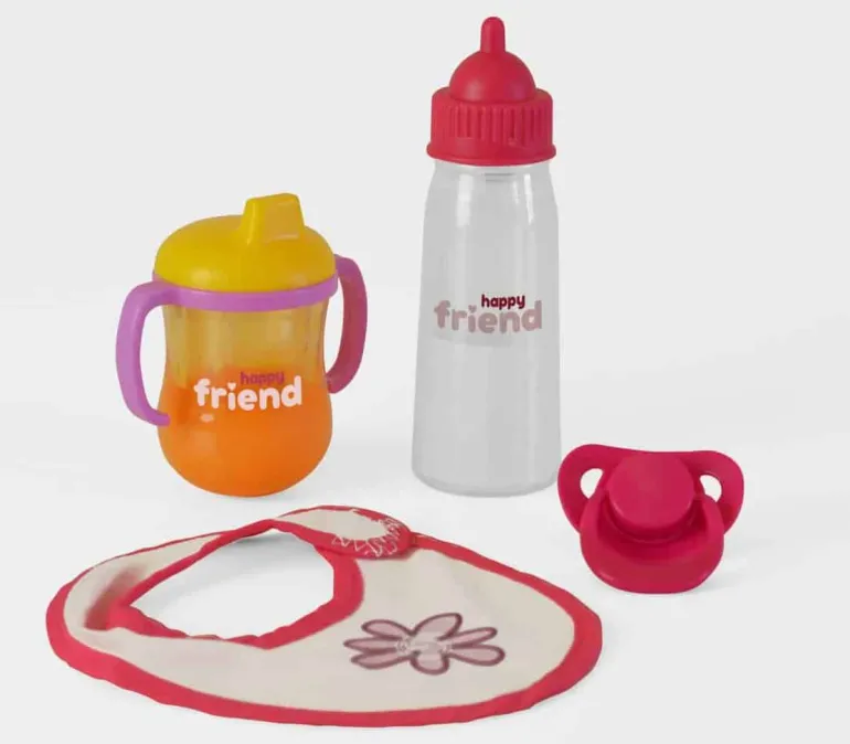 Spisetid! Din dukke vil altid være glad med dette flotte måltidssæt! Sutteflaske, juicekop, hagesmæk og sut sørger for, at dukken har alt, der skal til for at blive mæt og tilfreds. Indeholder 4 dele: Mælke-sutteflaske, juicekop, hagesmæk og sut. Fra 2 år.