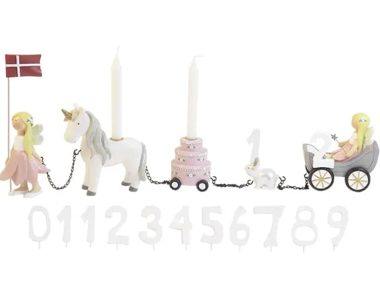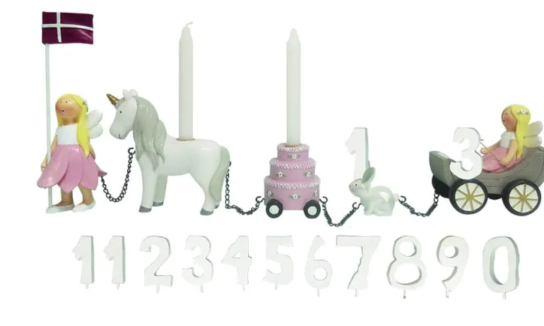 Fødselsdagstog, blomsterfeer m. 11 tal. Håndmalet. Polyresin materiale. Der er plads til to talnumre i toget. Inkl. flag og flagranke.