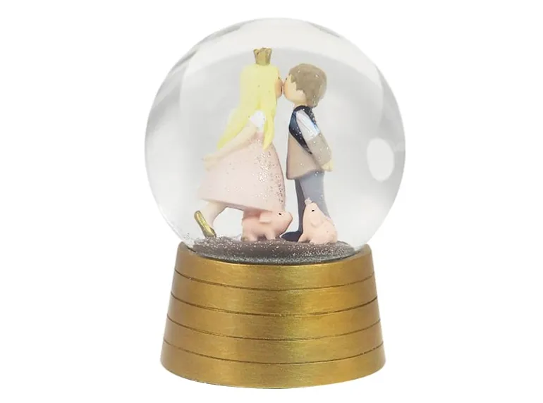 Kids By Friis Snekugle Med Musik – Svinedrengen, sød snekugle med guldfarvet bund med striber. Inde i snekuglen er de kendte figurer fra H. C. Andersens eventyr om svinedrengen: en prinsesse, en svinedreng og to grise. Prinsessen bukker sig ind over den ene gris og kysser svinedrengen.