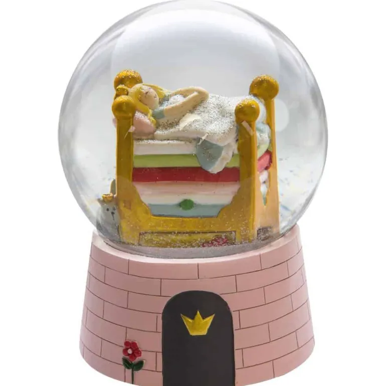 Kids by Friis snekuglen er håndlavet, og når den rystes, drysser der fint glimmer ned over prinsessen på ærten. I bunden kan kuglen trækkes op, og så spiller den en sød melodi: Beautiful Dreamer af Stephen Foster.