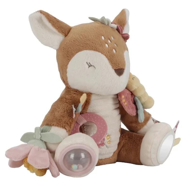Kram og leg! Denne dejlige hjort lover mere end bare kram. Opdag alle de spændende aktiviteter, den gemmer på. Der er en krøllet sommerfugl på skulderen, en raslende lyd og etiketter og blomster, som man kan røre ved og føle på. Ringene omkring benet, spejlet på den ene fod, en jordbærhale – der er så mange detaljer, der kan vække den lilles nysgerrighed. Og efter al den leg inspirerer den yndige hjort til de sødeste drømme.