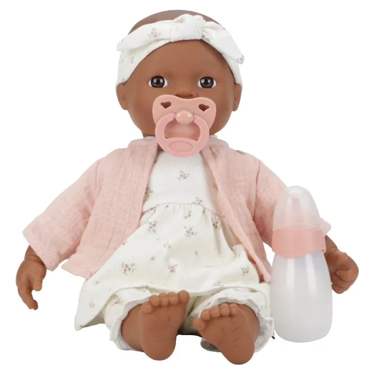 Noa er klædt i hårbånd, kjole og bukser med en blød, lyserød vest. At skifte hendes tøj fremmer finmotorikken, og sutten og mælkeflasken tilføjer et element af interaktiv leg.