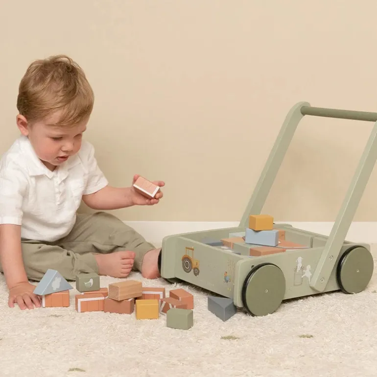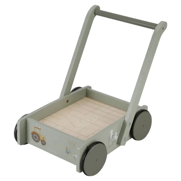 Gåvognen med klodser er udstyret med træhjul og fyldt med farverige træklodser med smukke illustrationer fra Little Farm-kollektionen. De varierende størrelser af klodserne fremmer farve- og formgenkendelse hos børn. Håndtaget er i den rigtige højde for småbørn, så de kan gå rundt i rummet komfortabelt. Denne sjove vogn fyldt med klodser der garanterer timevis af byggesjov og hjulene kan naturligvis bremses. Voksen samling af vognen er påkrævet.