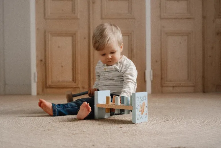 Bank, bank, bank! Brug hammeren til at slå de 6 farvede pinde ned i træbænken, og udforsk magien i Forest Friends. Når de alle er banket i, vend da bænken om, og begynd forfra! Dette er en rigtig god øvelse til udvikling af motorikken, som helt sikkert vil underholde dit barn i et stykke tid.