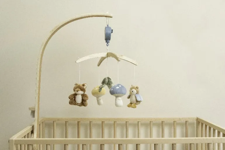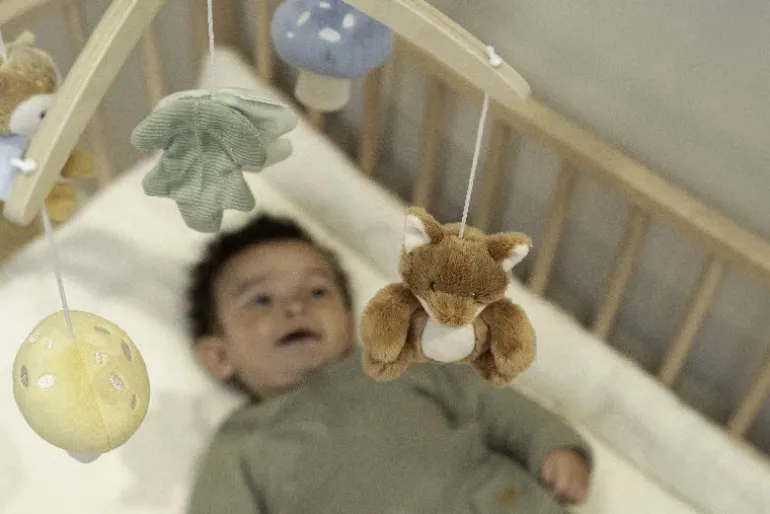 Denne søde musikuro i træ har en beroligende effekt på babyer takket være den søde vuggevise. Den indeholder fem forskellige hængende stykker legetøj fra Forest Friends-kollektionen: ræven, uglen, to svampe og et blad. Når dit barn nyder bevægelsen af hvert stykke legetøj, stimulerer musikuroen den visuelle udvikling. Musikuroen er velegnet fra fødslen og er nem at sætte fast i tremmesengen.