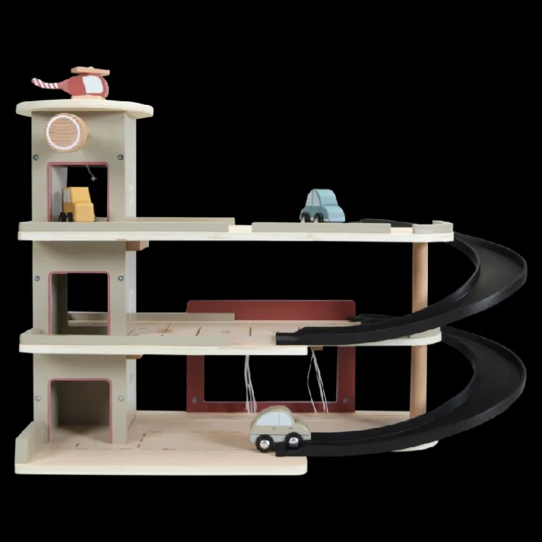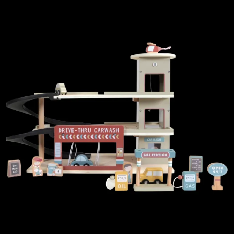 Stop ved parkeringsgaragen for at fylde benzin på, parkere din bil eller få den rengjort i bilvasken. Udvidelsessættet omfatter en garage med bilvask, biler, helikopter, tankstation, pumper, skilte og medarbejdere. Parkeringsgaragen er en af de mange legesæt, der kan kombineres med Little Dutch XXL togbanesættet. Parkeringsgaragen indeholder en helikopterplatform og træfigurerne og de forskellige dele har alle detaljerede illustrationer på begge sider. Lavet af holdbart og -certificeret træ. Ingen skinner er inkluderet i dette sæt.