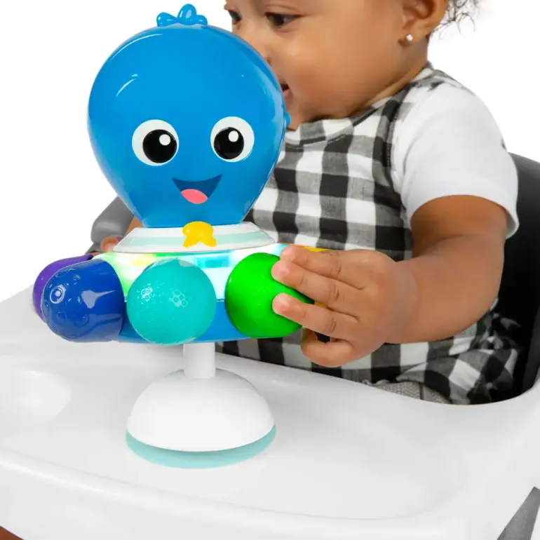 Baby Einstein Ocean Explorers legetøjet “Opus” støtter multisensorisk læring med lys og klare farver. Legetøjet underholder dit barn både derhjemme og på farten. Dit barn vil elske at se blæksprutten Opus lyse op og dreje sine tentakler ved hvert tryk, og barnet vil nyde at udforske legetøjets teksturer, lyde og klare farver. Forældrene vil sætte pris på muligheden for tidlig læring af farver og forholdet mellem årsag og virkning samt den visuelle stimulering. Takket være sin stærke sugekop, sidder Opus fast på de fleste glatte og hårde overflader og hjælper dit barn med at skubbe, dreje og lære derhjemme eller på farten. Legetøjet med den populære Baby Einstein-blæksprutte Opus kan tørres af og kræver 3 AAA-batterier.