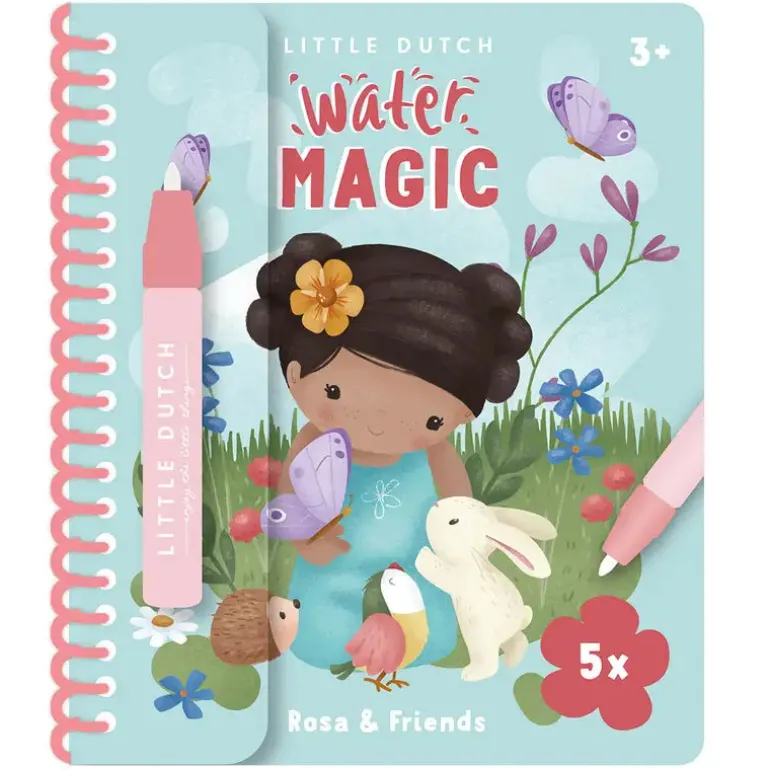Det er magisk! Med Little Dutch Rosa & Friends malebogen kan du lave de smukkeste tegninger af Rosa, Evi , Julia og andre i blomsterhaven. På hver side er et stykke allerede farvelagt så du kan se antydning af tegningen, der er gemt der. Fyld den medfølgende specialtusch med vand og begynd at tegne. Når der kommer vand på siden, dukker de smukkeste fineste tegninger op. Når siden tørrer, kan du lave tegningen igen og igen.