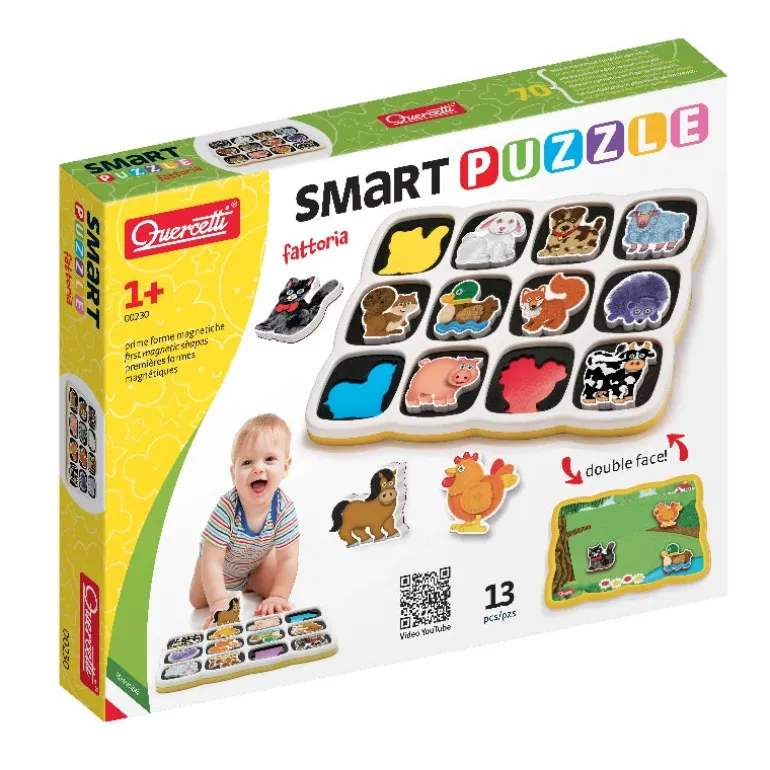 Quercettis magnetiske puslespil med den dobbeltsidede pusleplade træner børnenes finmotorik og introducerer dem til de mest elskede bondegårdsdyr.