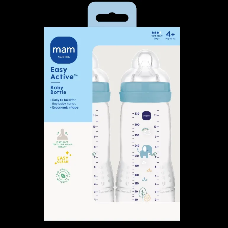 Gribevenlig og ergonomisk sutteflaske, der er perfekt til modermælkserstatning. MAM Easy Active har en bred hals, som gør flaskerne nemme at fylde og rengøre. Det lækagesikre låg kan også bruges som målestok. MAM Sut 3 med silkeblød silikone, MAM SkinSoft medfølger.