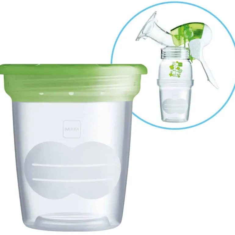 MAM opbevaringssæt bruges til opbevaring af brystmælk og barnemad. Koppen kan let skrues på den manuelle brystpumpe fra MAM. Den er ideel til køleskabet og fryser.