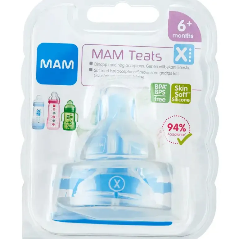 Flaskesut i silkeblød silikone, MAM SkinSoft, hvis overflade minder om mors hud og gør det nemt at skifte mellem amning og flaske. Størrelse X er til vælling og fuldkornsvælling. Passer til alle flasker fra MAM.