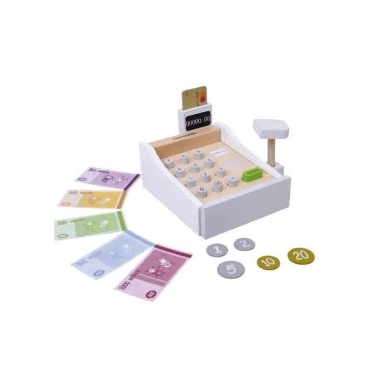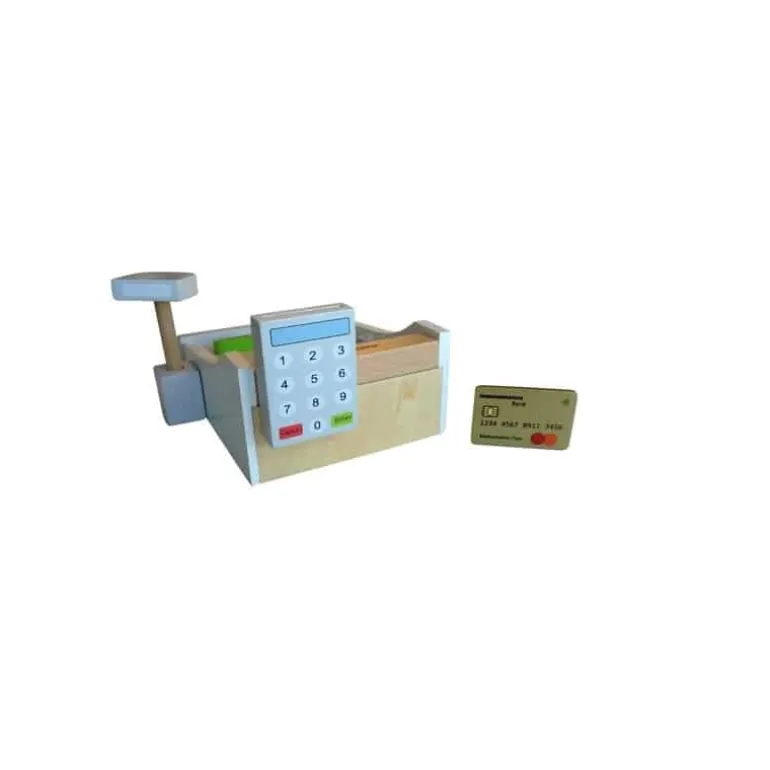 Kasseapparat, betalingskort, scanner og mønter er lavet af træ.