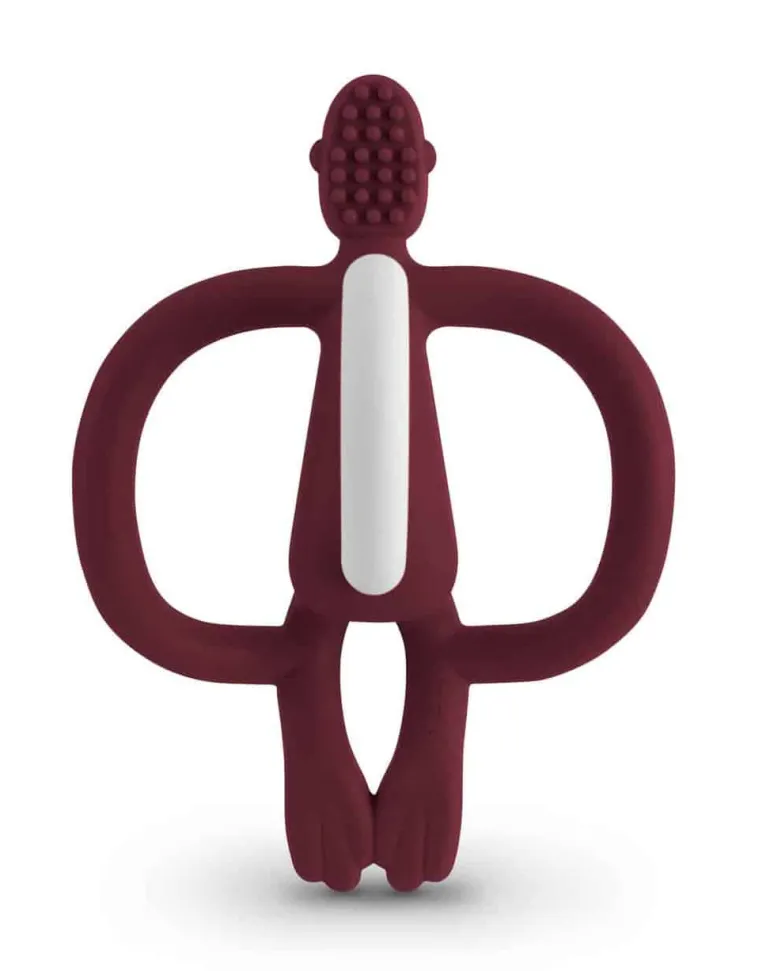 Matchstick Monkey Bidering – Claret. Sød lille bidering af blød silikone med ergonomisk design, så de små fingre nemt kan få fat i- og holde ved den. Bideringen er blød mod babys ømme gummer, når tænderne finder vej ud. Abens baghoved er designet med små bløde knopper, som kan afhjælpe kløe på gummerne. Den kan puttes i fryseren, så den er kold og dejlig at bide i.