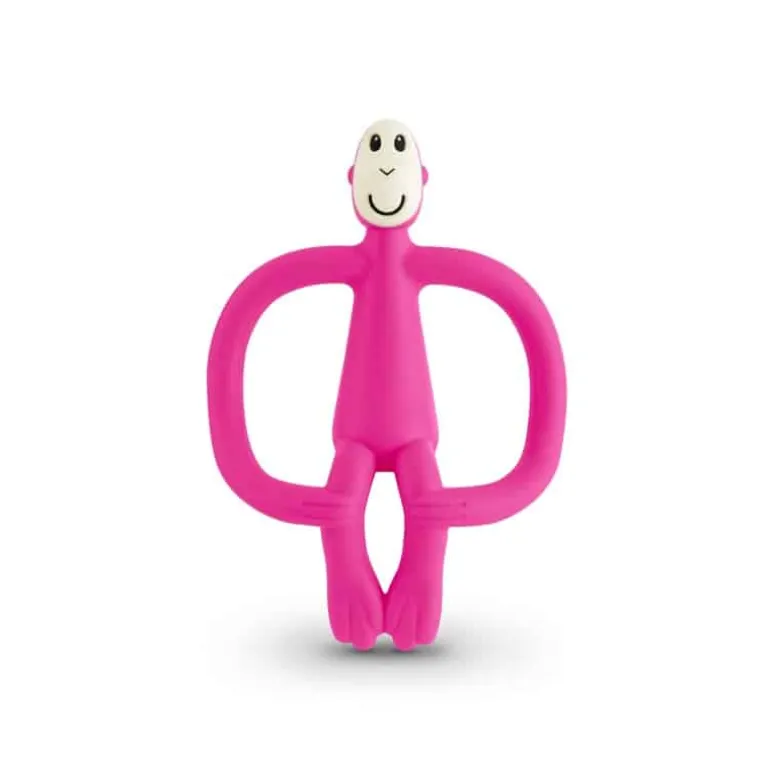 Matchstick Monkey Bidering – Pink. Sød lille bidering af blød silikone med ergonomisk design, så de små fingre nemt kan få fat i- og holde ved den. Bideringen er blød mod babys ømme gummer, når tænderne finder vej ud. Abens baghoved er designet med små bløde knopper, som kan afhjælpe kløe på gummerne. Den kan puttes i fryseren, så den er kold og dejlig at bide i.