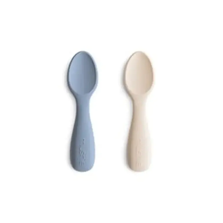 Giv dit barn den bedste start på fast føde med Mushies korte skeer, der er nemme at holde for små babyhænder. Designet i fødevaregodkendt silikone, er disse skeer både blide mod følsomt tandkød og nye tænder, hvilket gør dem ideelle til de første måltider.