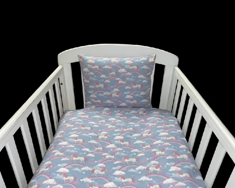 Baby sengelinned, dess. 1153 denim enhjørning og regnbue, str. 70×100-40×45 cm.