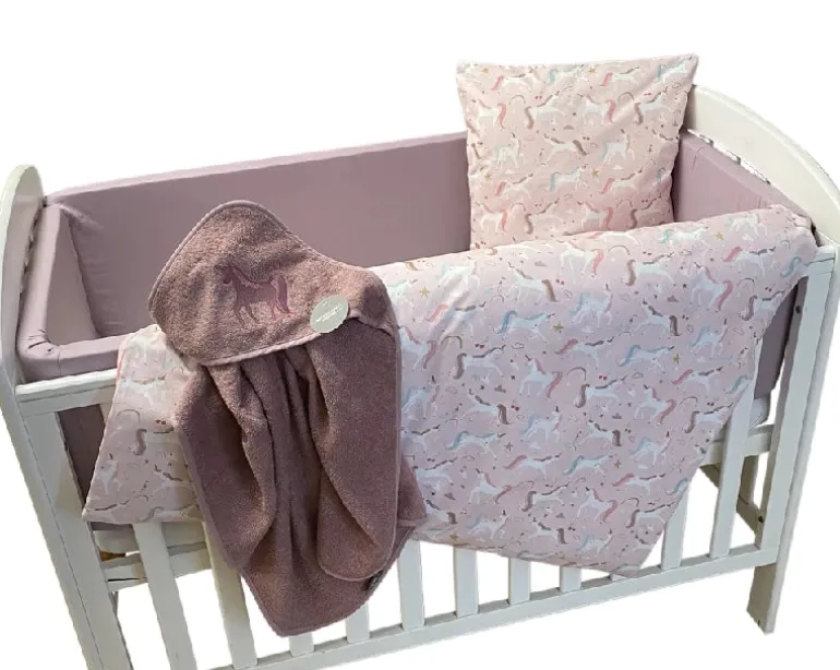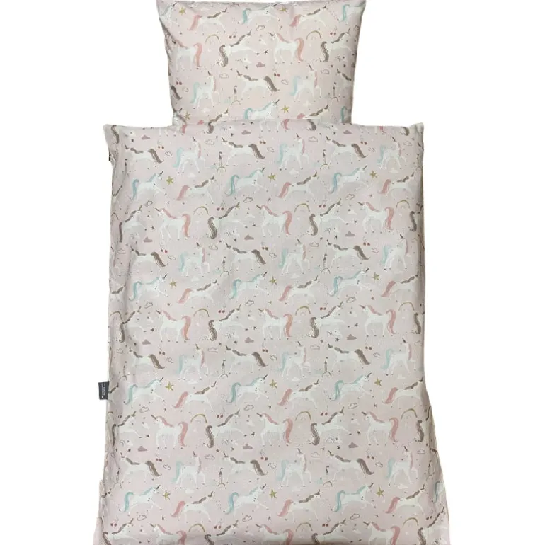 Lækkert og blødt junior sengesæt fra Nørgaard Madsen. Sengesættet er i rolige lyserøde og beige nuancer med enhjørninger. Stoffet er Oeko Tex bomuld og produceret i Danmark.