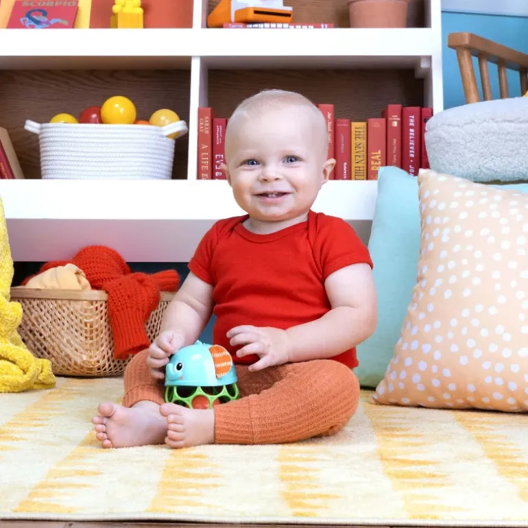 Bright Starts’ fleksible og holdbare Oball-teknologi fremmer babyens finmotorik, og de mange fingerhuller gør dette legetøj let for små babyer at gribe og lege med.