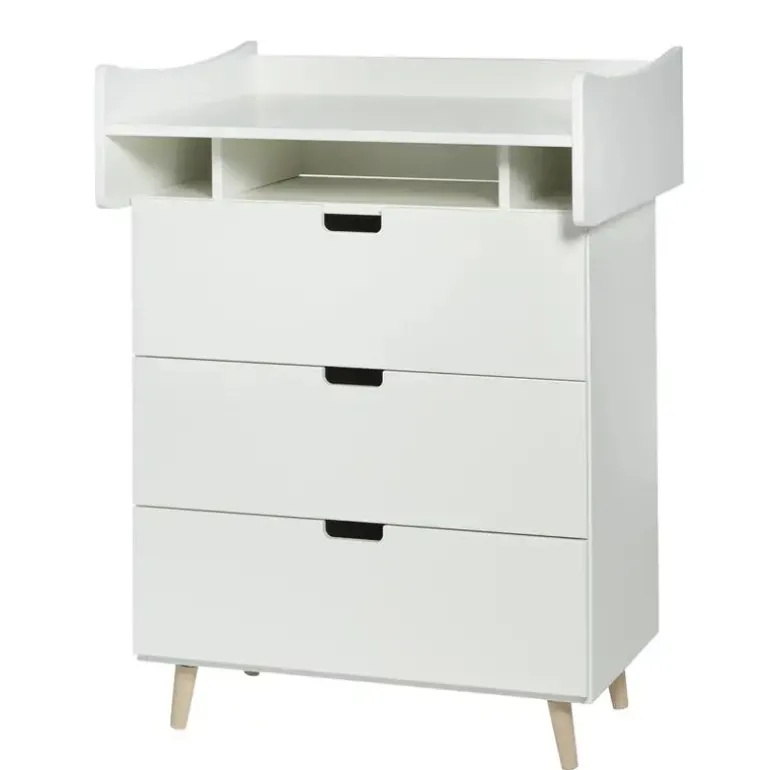 Puslekombination bestående af kommode med top God plads under pusletoppen til diverse udstyr. Kommoden er med 3 store skuffer med massive sider, som sikrer god stabilitet. Pusletoppen efterlader ingen mærker, når den fjernes, så kommoden kan anvendes selvstædigt i børneværelset. Sikkerhedstestet efter de strengeste europæiske standarder. Kombination af pusletop – varenummer 10990 og kommode – varenummer 10850 74*100*65cm