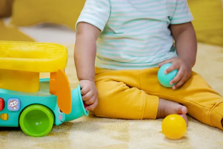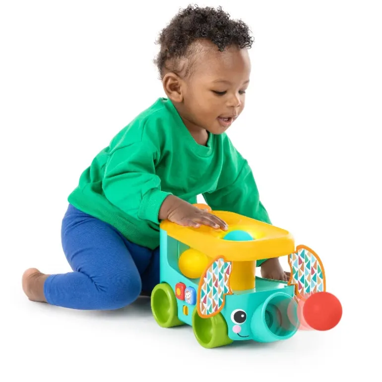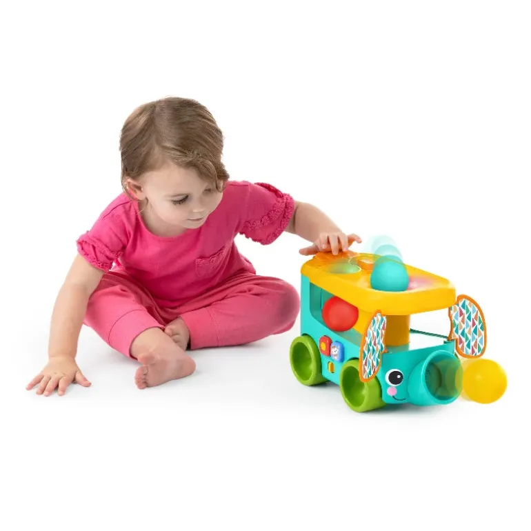 – Boldspillet i Bright Starts Pop & Roll Safari Bus træner finmotorikken og sørger for gode grin; smid boldene i de to øverste huller, eller klem dem ud af elefantens snabel.