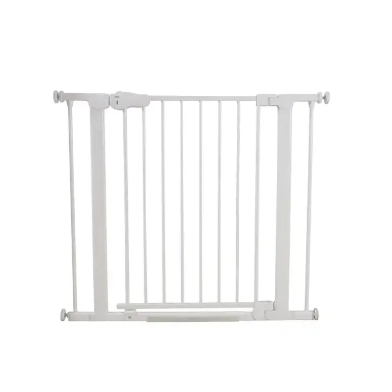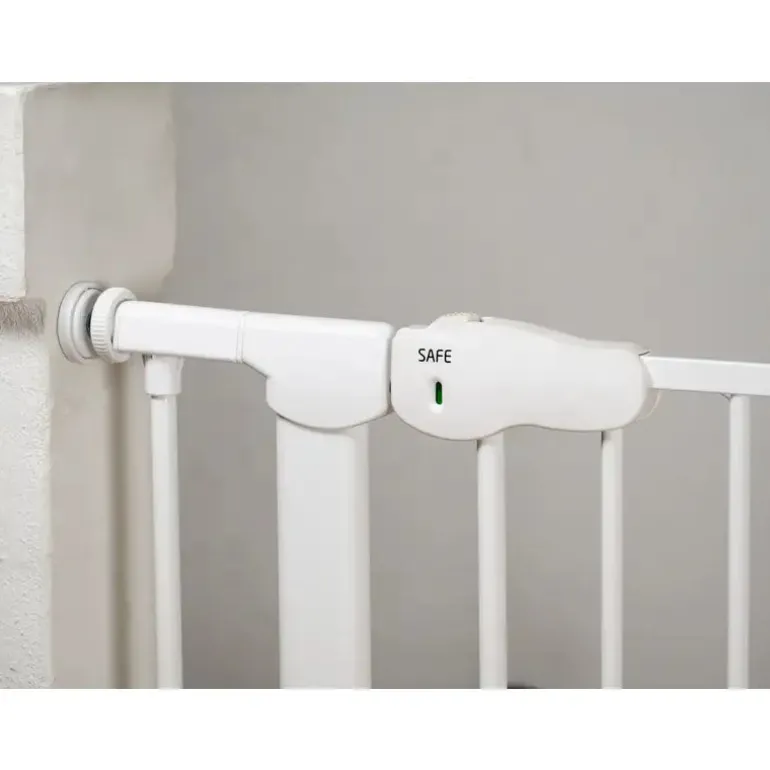 Presmonteret sikkerhedsgitter for børn.Dette sikkerhedsgitter er anvendeligt i alle stærke og ubeskadigede åbninger, dog ikke på toppen af trapper.Gitteret er meget velegnet til døråbninger og passager, der bruges hyppigt.Automatisk luknings-anordning.Indbyggede farve-indikatorer til ekstra sikring af korrekt installation og daglig brug.Mulighed for at blokere åbningen i en retning.3-vejs låse-mekanisme, som gør det svært for børn men enkelt for voksne at åbne.Ekstra nattesikkerhed med selvlysende bundvange.