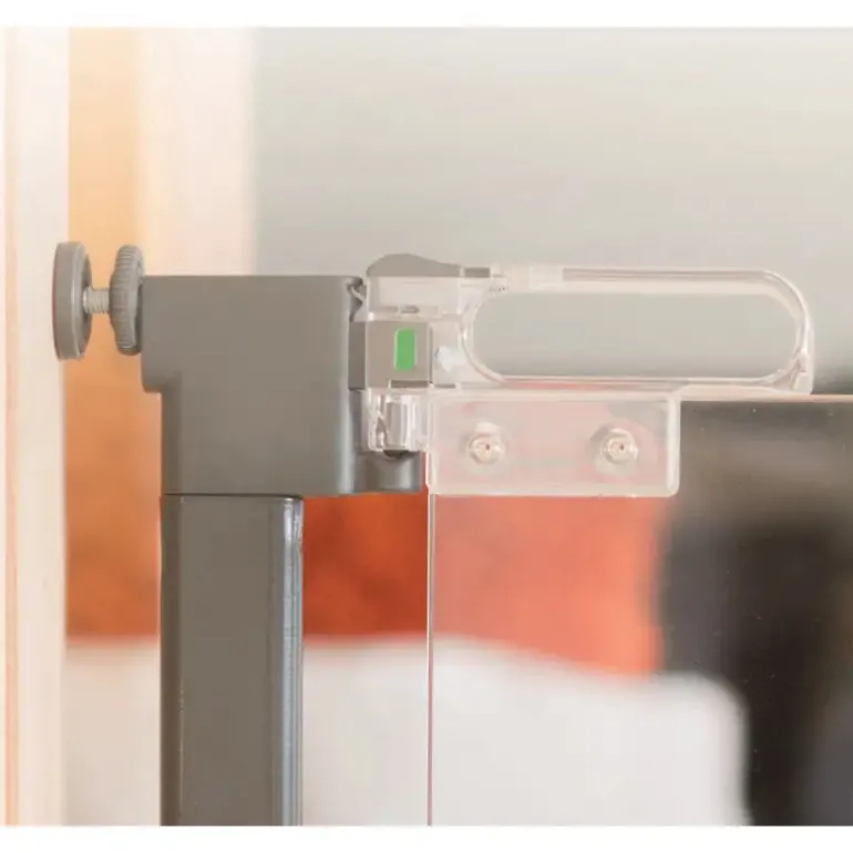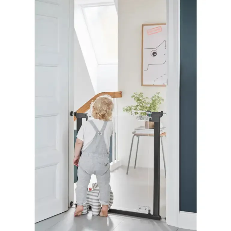 Presmonteret sikkerhedsgitter for børn.Dette sikkerhedsgitter er anvendeligt i alle stærke og ubeskadigede åbninger, dog ikke på toppen af trapper.Gitteret er meget velegnet til døråbninger og passager, der bruges hyppigt.Indbygget indikator til kontrol af korrekt montering og optimal funktion i den daglige anvendelse.Mulighed for at blokere åbning den ene vej.Indbygget tryk-og-løft-funktion for nem betjening. Svært for børn, men enkelt for voksne.Magnetlås med farveindikator for sikker automatisk lukning.Ekstra nattesikkerhed med selvlysende bundvange.