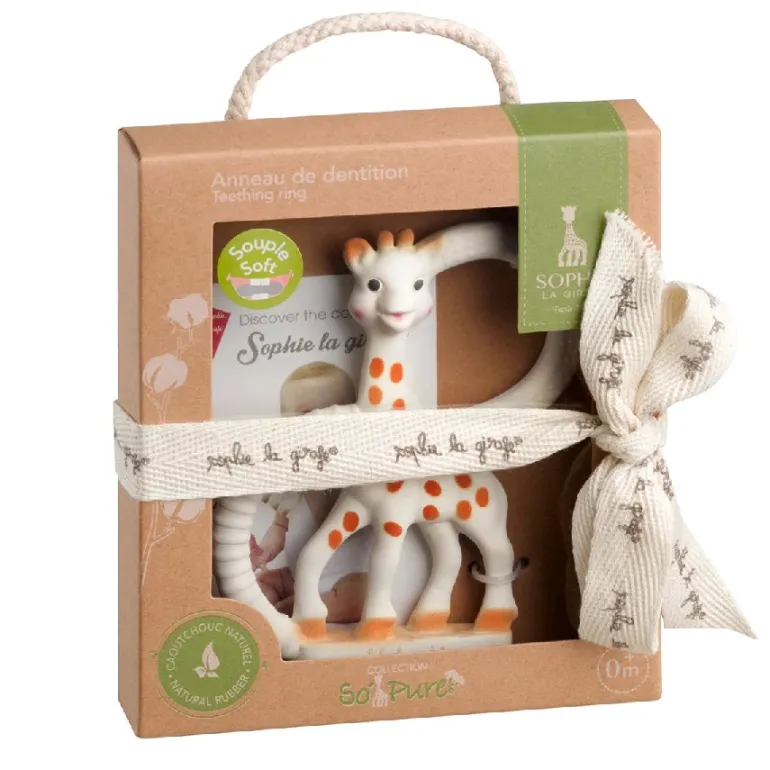 Sophie Giraf Bidering. Babys første bidering produceret af 100% ren naturgummi, som er helt fri for BPA og phthalater. Udelukkende produceret af naturgummi og farvet med ugiftige plantefarver. Denne bidering er en ekstra fleksibel model, der er særdeles egnet til de første spæde tandfrembrud – og så er den blid og behagelig, at tygge på, samt let, at gribe fat i og holde fast på for små fingre. Bideringen er udstyret med massere af dele, at tygge i og undersøge.