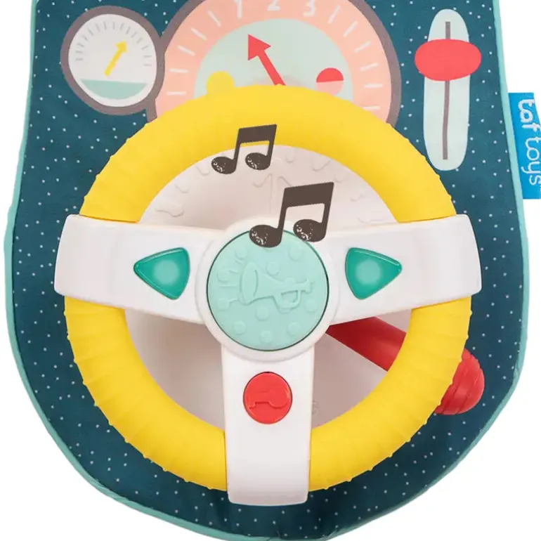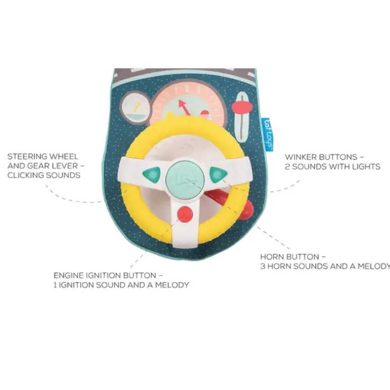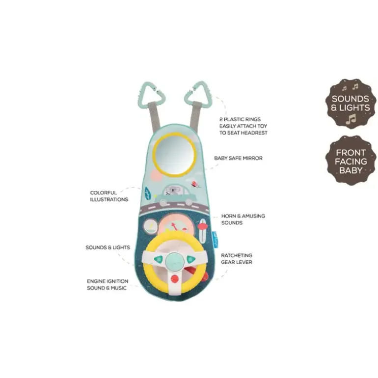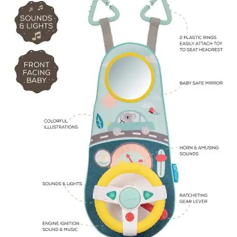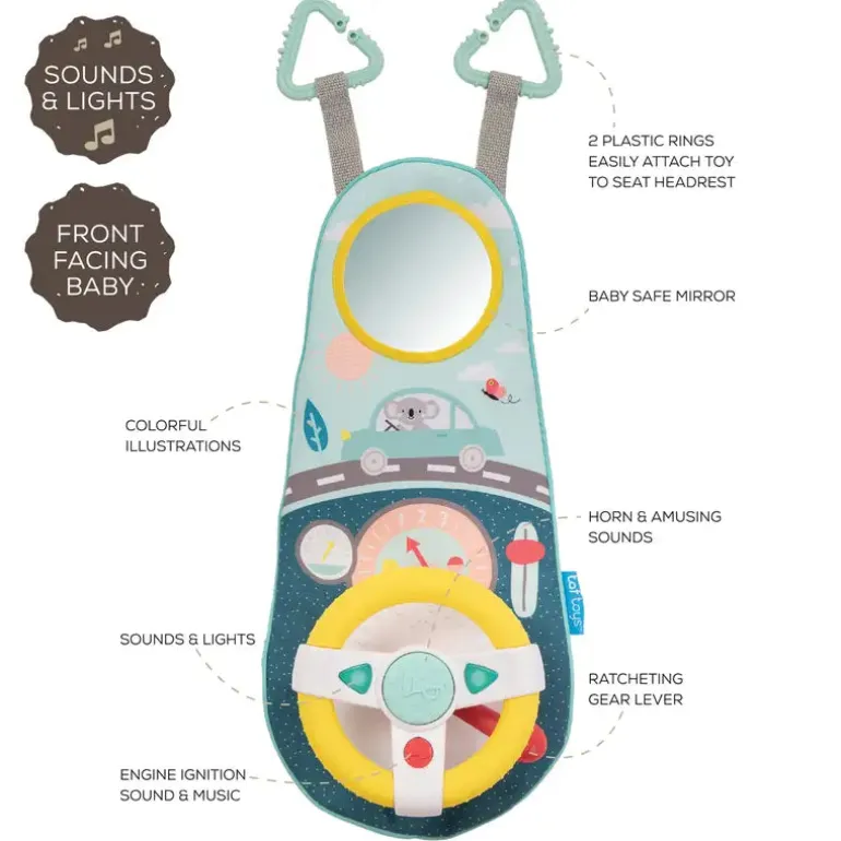 TAF Koala Rat til bilturen med lys og lyd gør bilturen underholdende og lærerig for barnet, der sidder fremadvendt i bilen. Udvikler barnets fin- og grovmotorik, når det drejer på rattet og gearstangen og trykker på aktivitetsknapperne. Lysene og lydene stimulerer udviklingen af ??barnets sanser. De sjove billyde og lyset aktiveres, når barnet trykker på knapperne og lærer om årsag og virkning, og rollelegen udvikler fantasi og sprogfærdigheder.