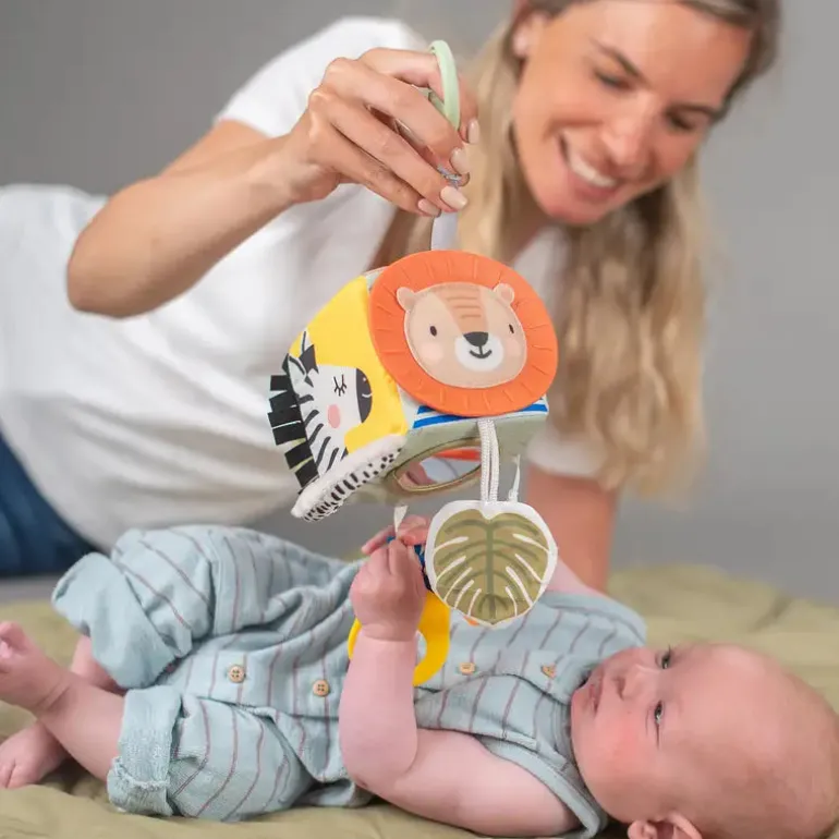 Savannah Discovery Cube er et aktivitetslegetøj fra TAF Toys med materialer, lyde og andet sjovt, der overrasker og stimulerer til leg og udvikling. Legetøjet har plastikringe, rangle, bidelegetøj, sjovt ansigt på hver side, børnesikkert spejl, lyde der spilles når man trækker i snoren og stof med forskellige mønstre og former. Der er en ekstra stor ring så det er let at sætte legetøjet på fx barnevognen, sengen eller vuggen.
