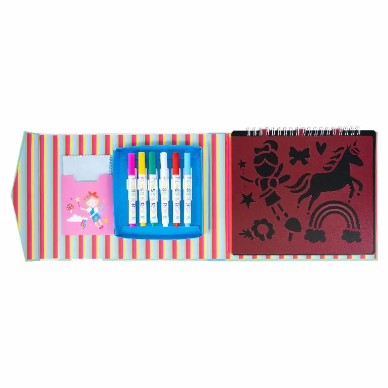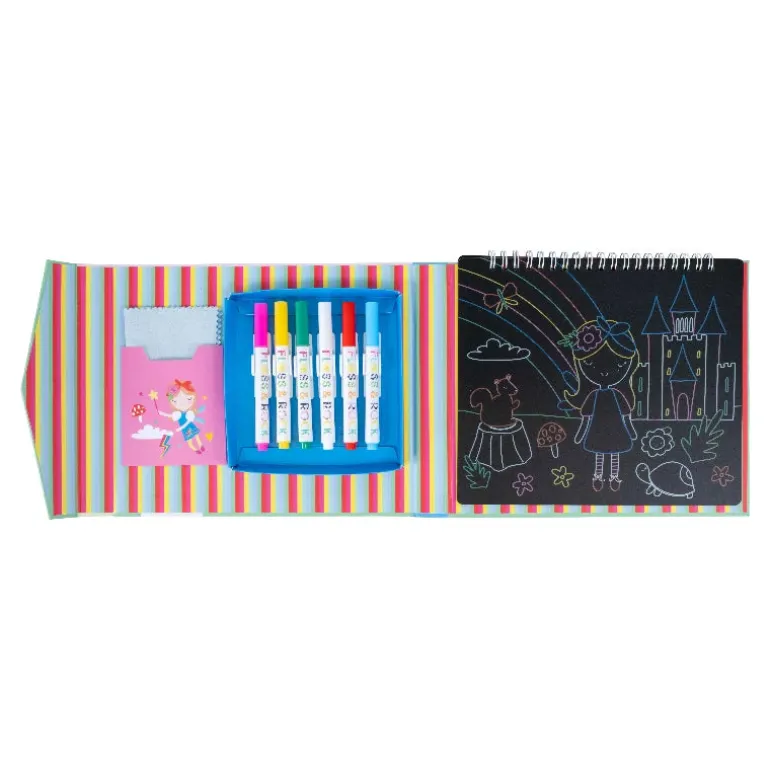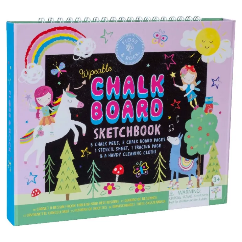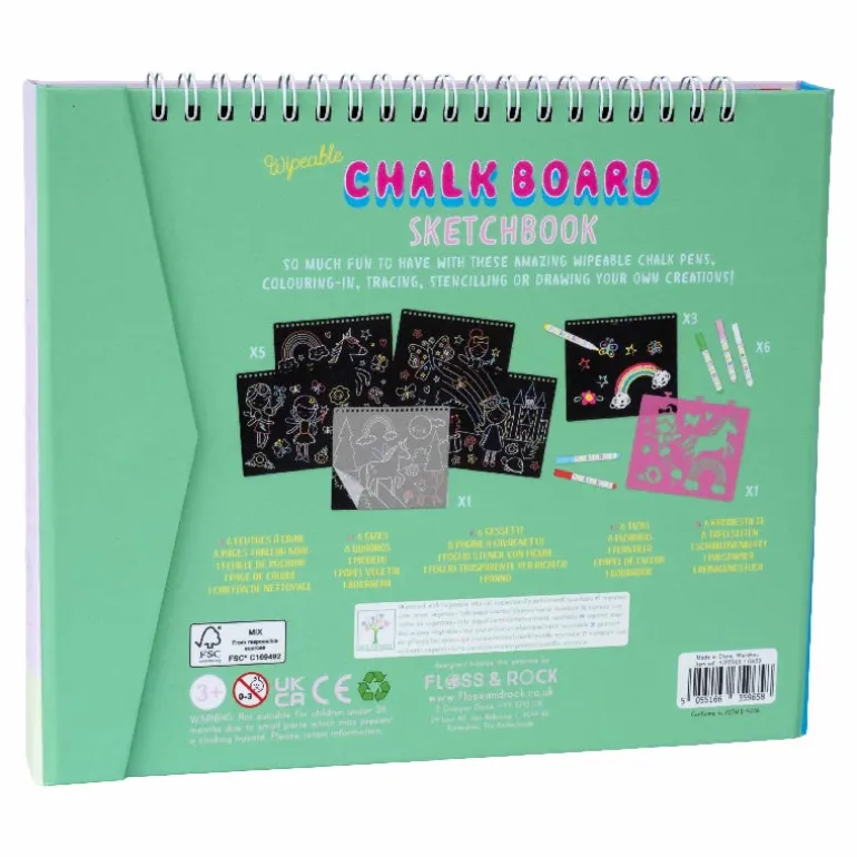 En sjov kridttavle i et skitsebogsformat, der kan aftørres! Denne geniale Regnbue Skitsebog indeholder 8 sider. 5 sider som er klar til farvelægning, plus 3 almindelige sider klar til fri fantasi! Der er også en skabelon med regnbue-tema. Skitsebogen leveres med 6 forskellige kridtpenne og en praktisk rengøringsklud til at tørre siderne rene!