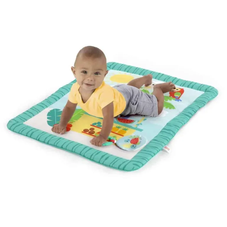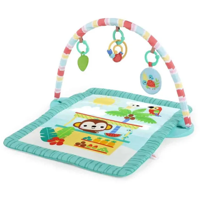 At ligge på maven føles som en ferie med denne helt tropiske måtte! Tiki Toy Bar aktivitets-gym fra Bright Starts er fyldt med legemuligheder til forskellige aldre og stadier. Der er 3 måder at lege på: lig på maven, lig og leg eller sid og leg! Fra buen ovenover dingler aktivitetslegetøj, som babyen kan ligge ned og række op efter eller kan sidde op og lege med, mens den udvikler sig. Øv finmotorik med perlejagts-legetøjet, rør og klem krøllemedaljonen og udforsk alle detaljer i bladlegetøjets struktur. Når legen er forbi, så er den kompakte måtte let at folde sammen og opbevare. Med denne legemåtte er der dømt solskinshimmel og smil!