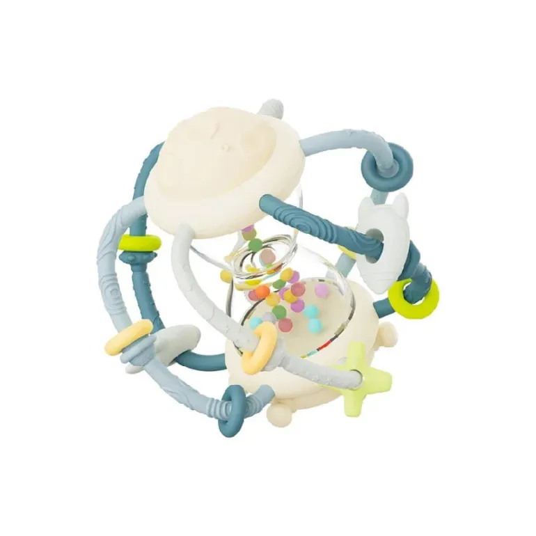 Aktivitetsrangle med mange spændende detaljer for baby at undersøge. Med forskellige overflader og teksturer, som masserer babys ømme gummer. Nem at gribe fat om.